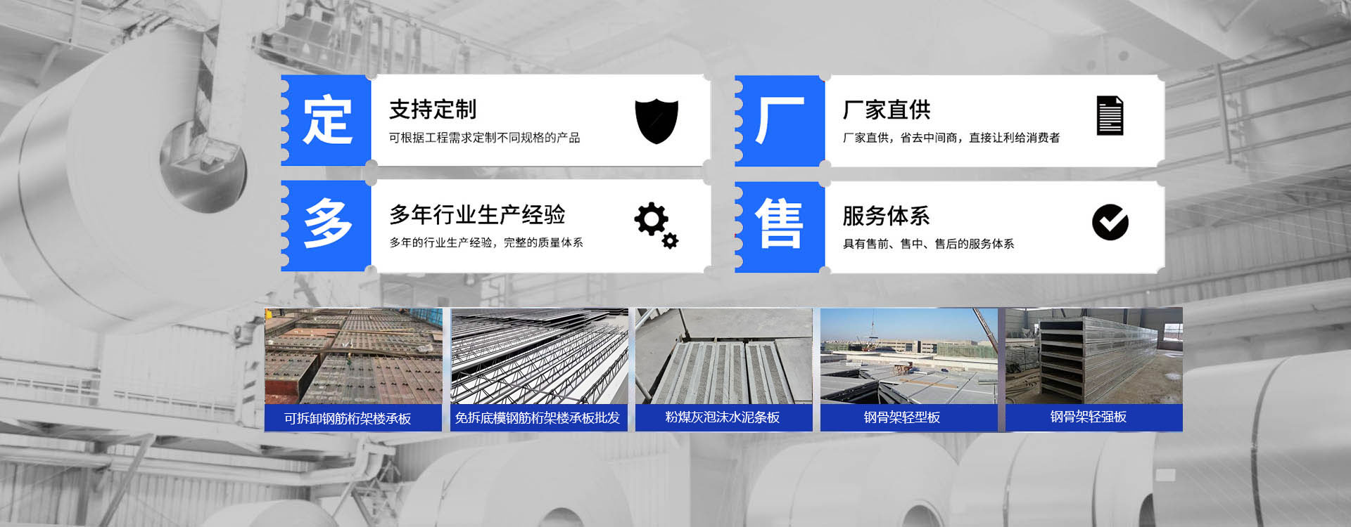公司主营:免拆底模钢筋桁架楼承板,可拆卸钢筋桁架楼承板,钢骨架轻型/强板,粉煤灰泡沫水泥条板。